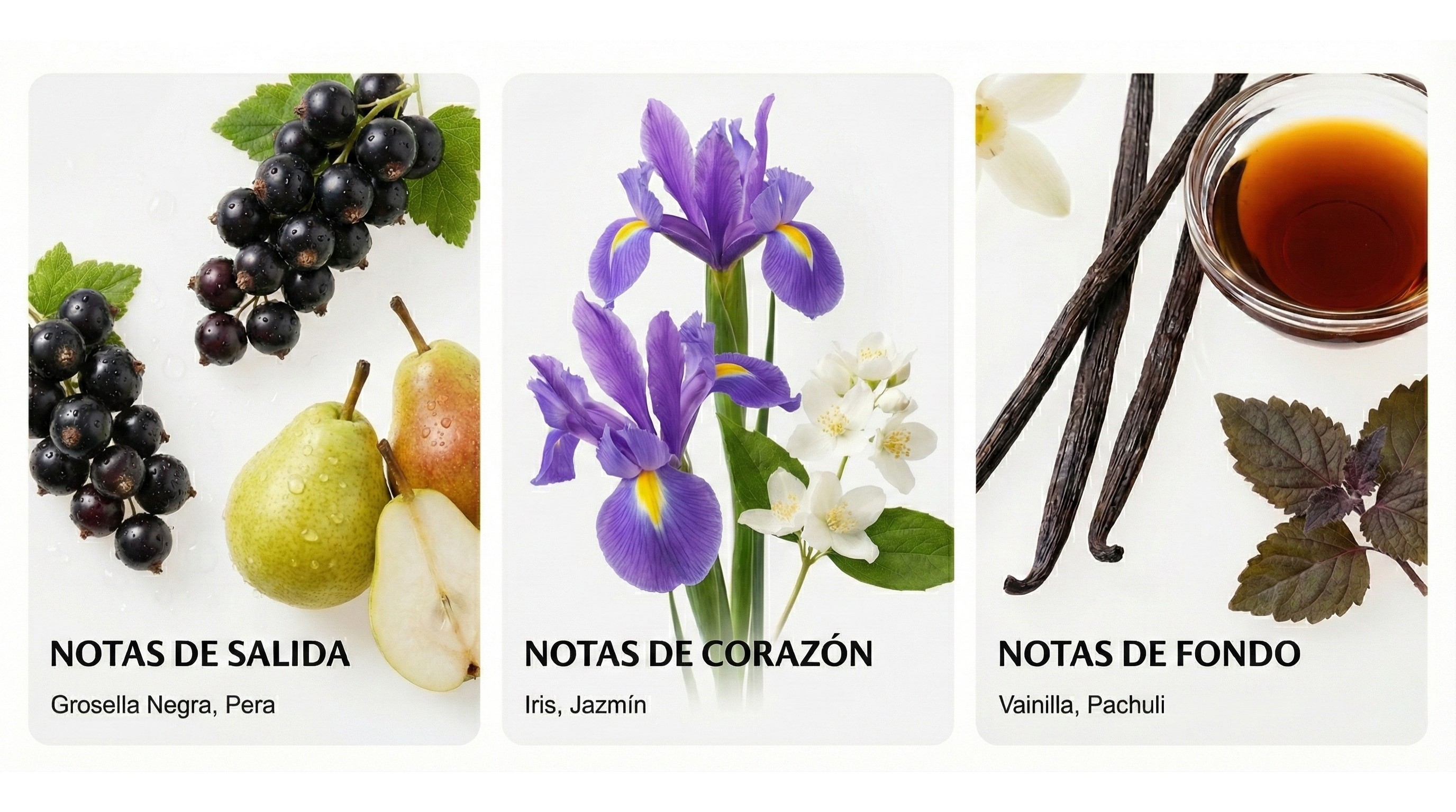 ● Notas de fondo: Vainilla · Pachuli